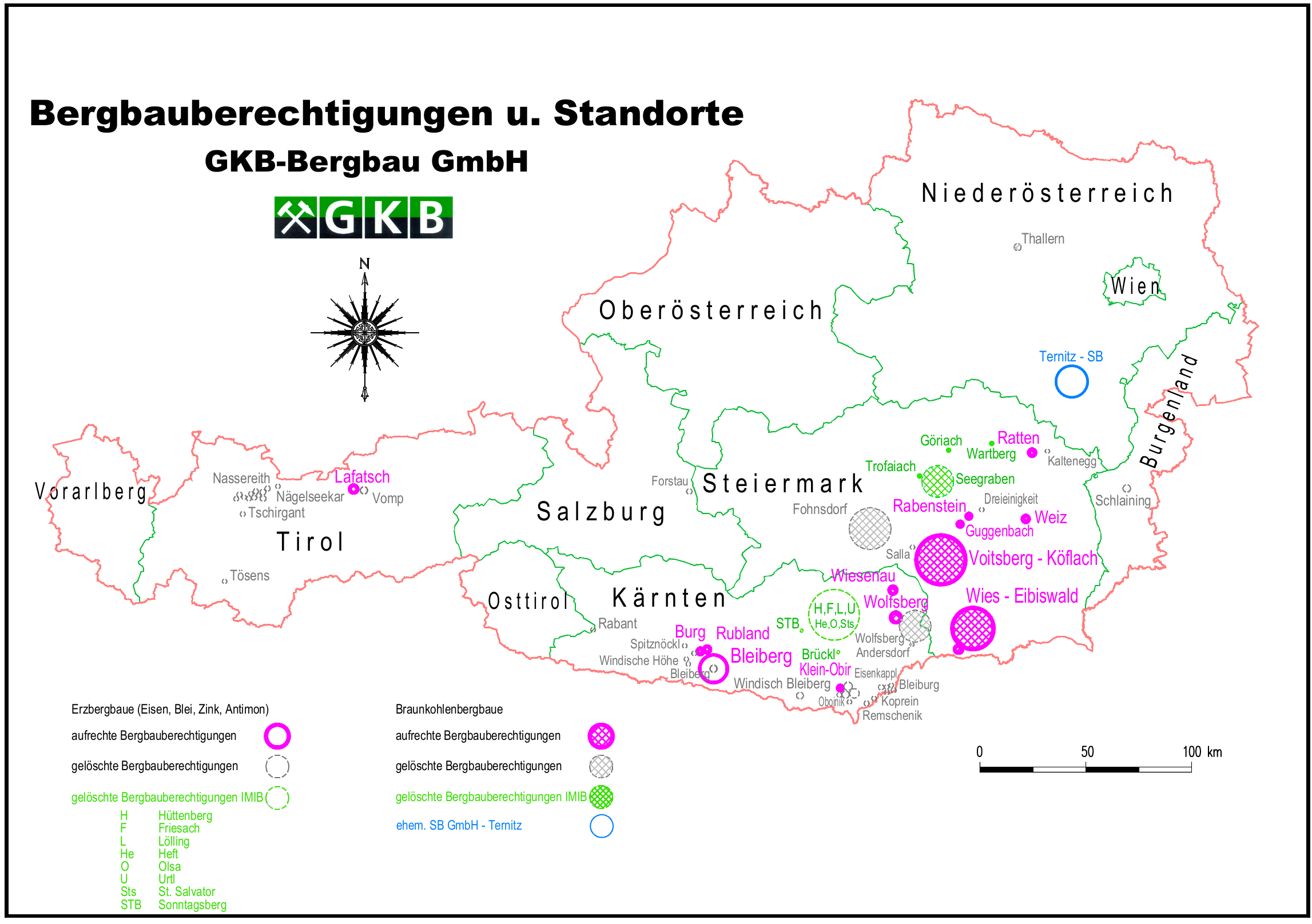 In Abbildung 1 sind die Bergbauberechtigungen und Standorte der GKB-Bergbau GmbH dargestellt. Der Zuständigkeitsbereich der Gesellschaft erstreckt sich nahezu über das gesamte Bundesgebiet, wobei das Gros der Bergwerksberechtigungen in den Bundesländern Steiermark und Kärnten liegt.